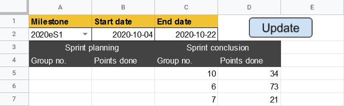 The milestone, start, and end dates are input, and then the Update button is pressed to fill in the sheet.